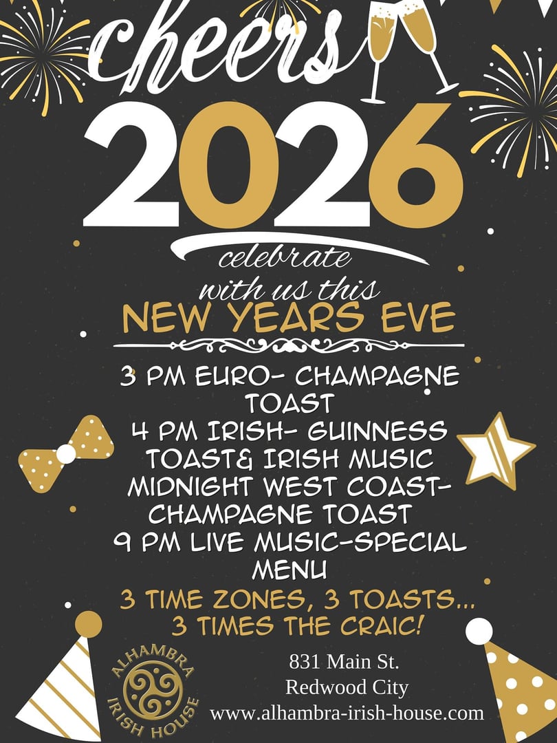 Join us for NYE celebration Wednesday 12/31/25 Central European NYE is at 3pm ! Join us for Brunch & free Champagne toast 🥂! Irish New Year at 4pm with Irish live music by @stephenross_music 3-5pm 🇮🇪! Free Guinness toast! 4- course meal special is available from 5pm! 1920’s NYE Great Gatsby style with 4-course meal, Live music, dinner & free champagne toast 🥂🍾 at Midnight!